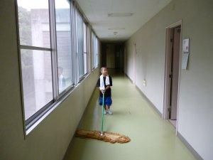 広い廊下を 担当 掃除するバンちゃん あんたはエライ |