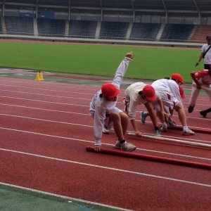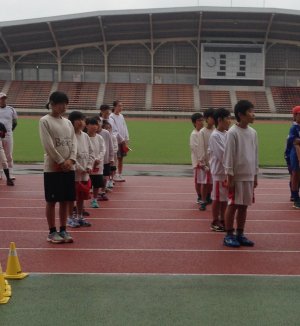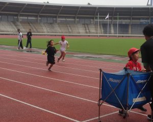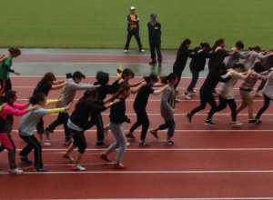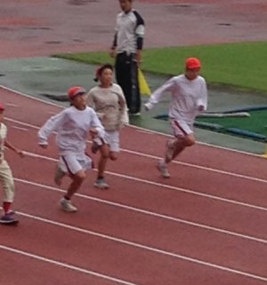 小雨が降る中、運動会はじまり 柏の葉競技場で走るんだから、記念に なりますよ。 |