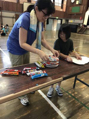| 後半戦は、うまい棒ツムツム 壊れないで高く積んだほうが勝ち。タイムレースだから、あせるねー |